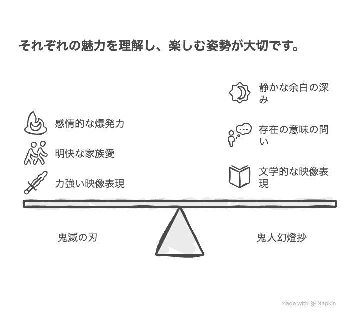ダイナミズムとインパクトの『鬼滅の刃』、静寂と余韻の『鬼人幻燈抄』という構図で語ると、その違いがより明確に見えてくるでしょう。