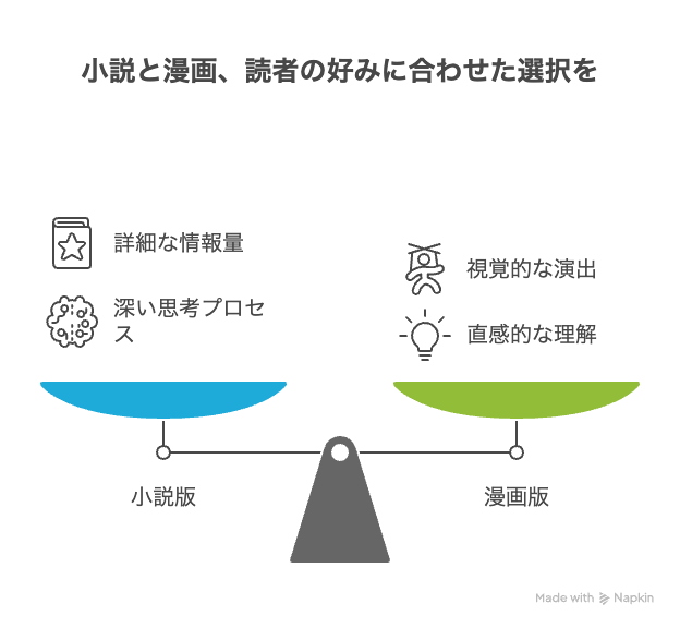 この記事では、漫画版と小説版の違いを徹底比較し、どちらがあなたに合っているかを解説します。