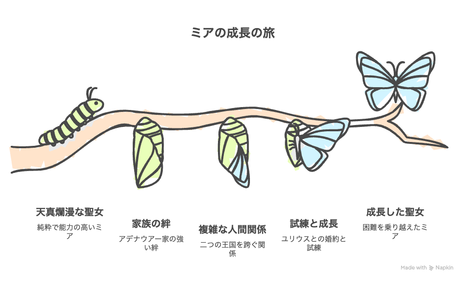 物語が進行するにつれ、ミアは聖女としてだけでなく、一人の女性としても大きく成長していきます。