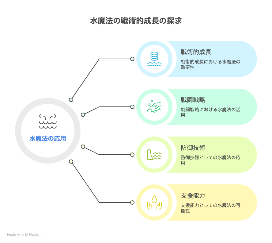 • 水魔法の応用が戦術的な成長を示している点